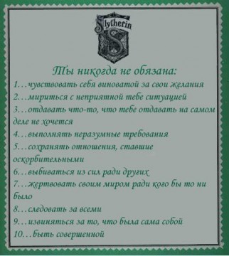 Слизерин… Как много оттенков в этом слове. И с каждым годом оно звучит совершенно иначе, постепенно наделяется новым смыслом, который приходит лишь с опытом. Слизерин в дошкольные годы Факультет, на котором училась моя мама. Чаще всего туда попадают чистокровные волшебники, но и полукровки иногда тоже туда распределяются. Если верить маме (а не верить ей нельзя!), там учатся умные, хитрые маги, способные из любой ситуации найти выход. Это факультет избранных, место, где собирается зачастую элита. Но Слизерин – это также опасность быть заклеймённым как тёмный маг. В общем, Слизерин – факультет, о котором ходит масса слухов. Слизерин на 1 курсе Все старшекурсники уверяют, что я не зря попала на этот факультет, потому что меня, как и всех слизеринцев, ждёт великое будущее. Я – избранная, я – часть элиты, я – та часть магического общества, что в будущем будет вершить историю. И мне это нравится. Я ношу свой знак отличия с гордостью, ведь я знаю, что Мерлин – выпускник Слизерина. Также я знаю, что слизеринцев недолюбливают, но это всё глупые предрассудки, которые развеются со временем. Слизерин на 2 курсе Осознание, что я – часть элиты, не ушло, но притупилось. Мне не удалось найти друзей на курсе и даже на целом факультете. Знаю, мой характер – не подарок, но ведь никто так и не попытался найти ко мне ключик! Я общаюсь лишь с немногими из студентов, чаще занимаюсь совершенствованием своих знаний и умений. Ведь меня ждёт великое будущее! Я искренне верю, что слизеринец не равно тёмный маг. И собираюсь всем это доказать! Слизерин на 3 курсе Внезапно приходит осознание, что через два года предстоит сдавать СОВы, а я ещё так мало знаю! Мои однокурсники не так активно поддерживают моё рвение в учёбе, как хотелось бы, дразнят ослизеринившимся орлёнком. Но я-то знаю, что они не правы! Знания – вот опора для развития! Чтобы двигаться дальше, нужно совершенствоваться! С друзьями по-прежнему напряжённая ситуация, но ничего, всё улучшится, не сейчас, так со временем. Пока что мне не удалось доказать другим факультетам, что слизеринцы далеко не такие, как о них думают, но времени ещё много! А пока что можно спокойно учиться – больше узнавать, больше понимать, больше осваивать. Всему своё время. Слизерин на 4 курсе СОВы всё ближе, осталось всего два курса! Однокурсники посмеиваются и не думают о столь далёком, но я так не могу. Я продолжаю учиться. И пытаюсь объяснить окружающим, каков Слизерин на самом деле. Только сами слизеринцы не спешат мне помочь в этом. Слизеринцы – хитрые, умные, способные, в большинстве своём эгоисты, как и я сама. Слизерин – это люди, которые направят общество в лучшее будущее! Именно поэтому слизеринцы – представители элиты, те, кому суждено писать историю. И я верю в это всем сердцем! Слизерин на 5 курсе Всё меняется. Причём ситуацию омрачает не только стремительное приближение СОВ! Пожиратели смерти захватили власть. И это сильно сказалось на статусе слизеринцев в Хогвартсе. Большинство представителей других факультетов считают нас будущими пожирателями, тёмными магами, которые поведут страну к гибели. Почему? Почему всё происходит так? Неужели Слизерин и правда оплот тьмы в этой стране? Неужели и правда во всём виноваты слизеринцы? Не верю! Потому что я не такая! Потому что Слизерин не таков! И я всем докажу! Слизерин на 6 курсе Кое-как СОВы